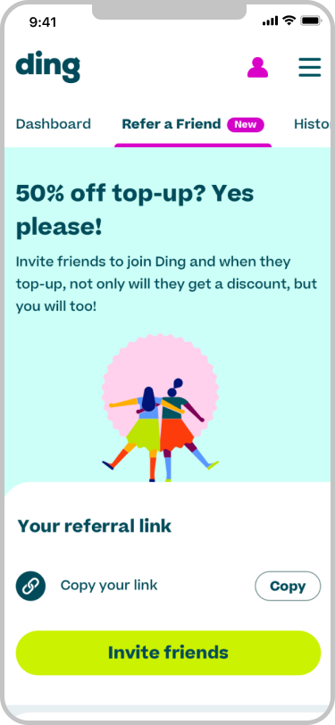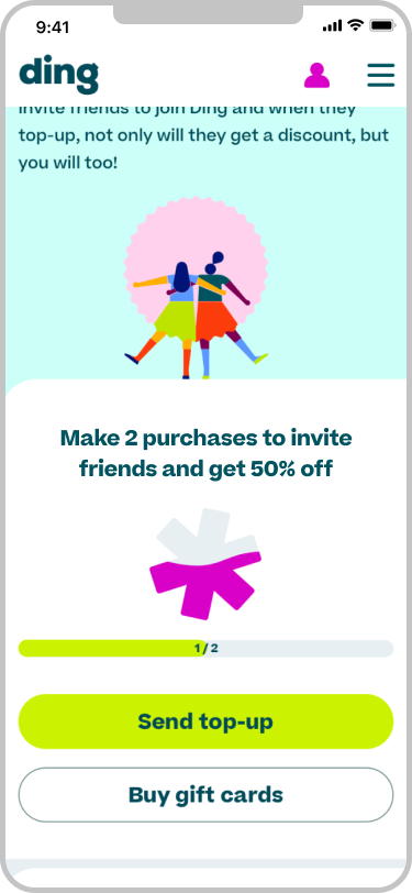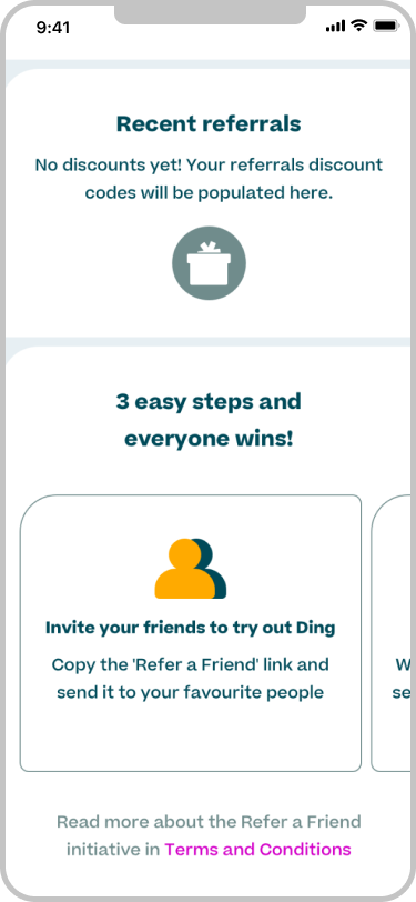 In 2021 Ding wanted to introduce a Refer A Friend (RAF) programme. This feature would sit in the existing Ding.com website and required a UI for both the RAF sender and receiver (the ‘friend’).