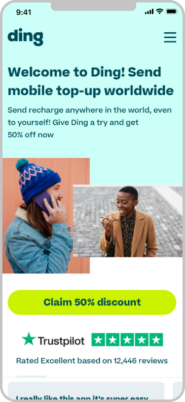The receiver may not have heard of Ding before, so it was vital to highlight our trustworthiness. I included Ding’s Trustpilot score above the fold (and directly under the CTA). I also included user reviews.